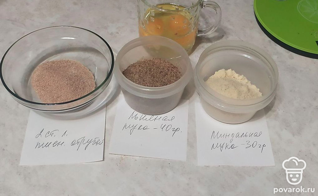 Добавьте пшеничные отруби, льняную и миндальную муку. Положите немножко соли, 1/4 чайной ложки, соды, гашенной уксусом. Приправьте кориандром молотым, 1/4 чайной ложки. Перемешайте.