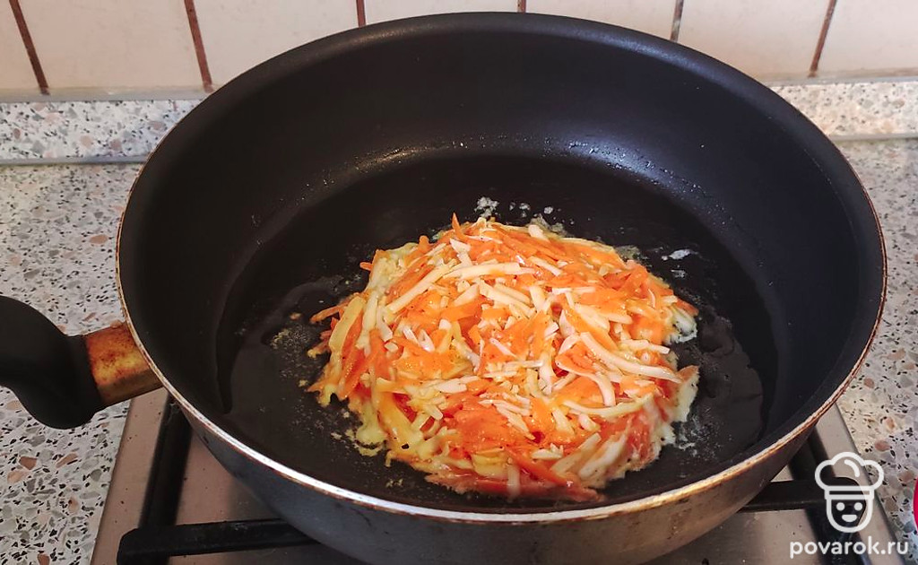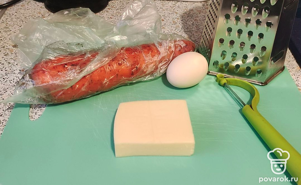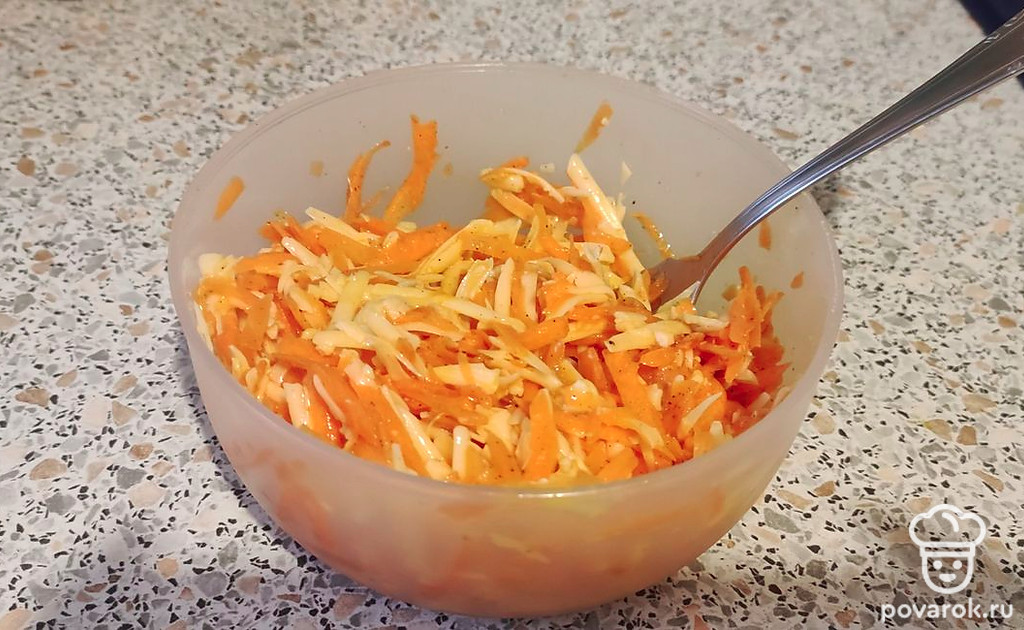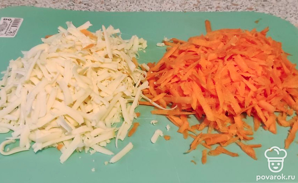 Одинаковое количество сыра и моркови натираем на крупной терке.