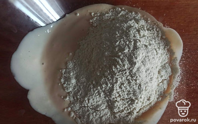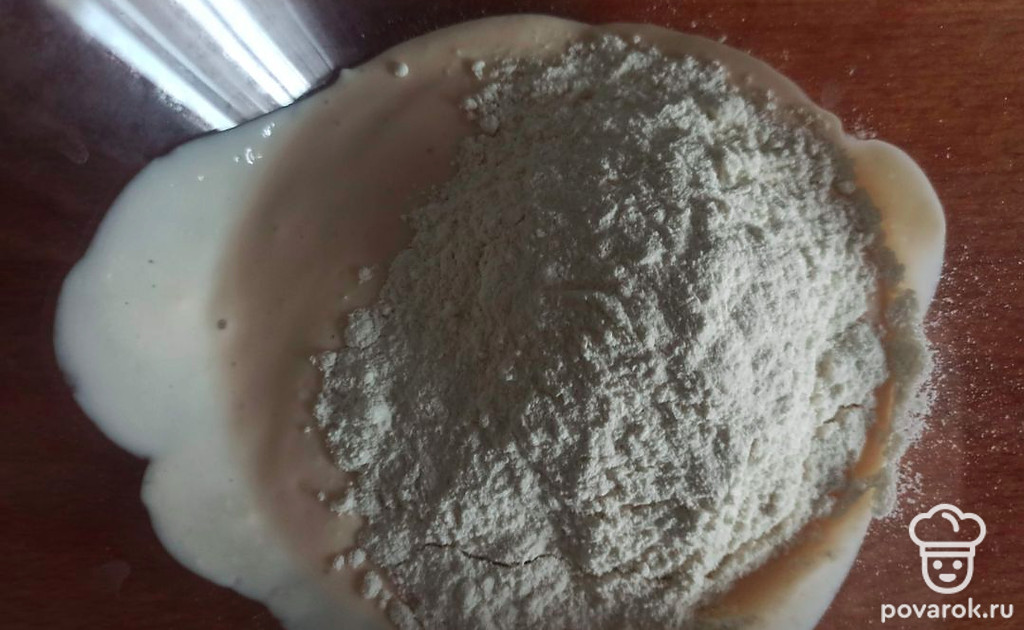 К ряженке добавьте муку и соду, замесите тесто.
