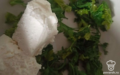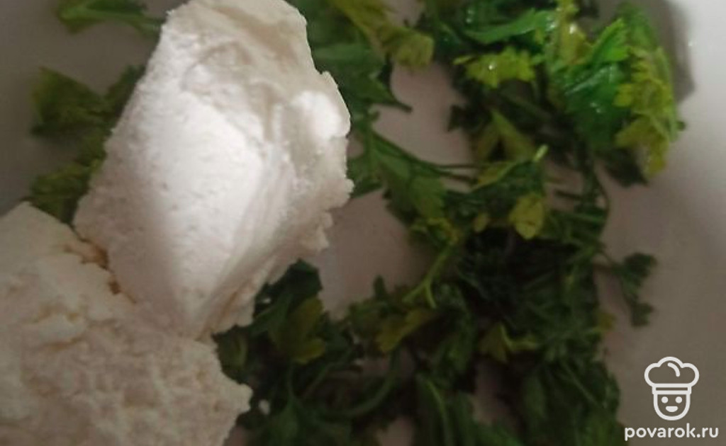 Петрушку нарежьте и смешайте с творогом. Посолите по вкусу.
