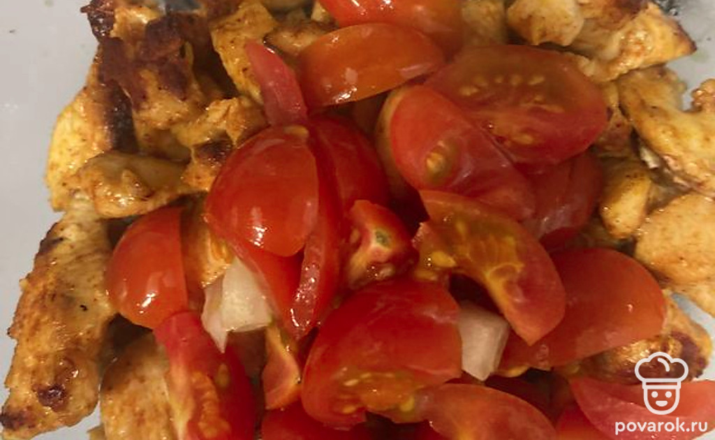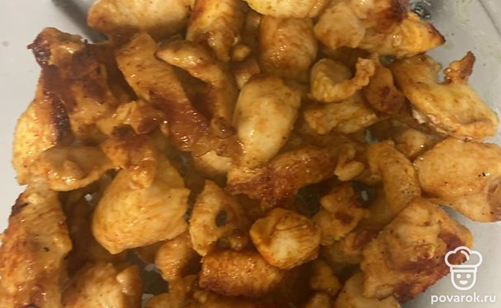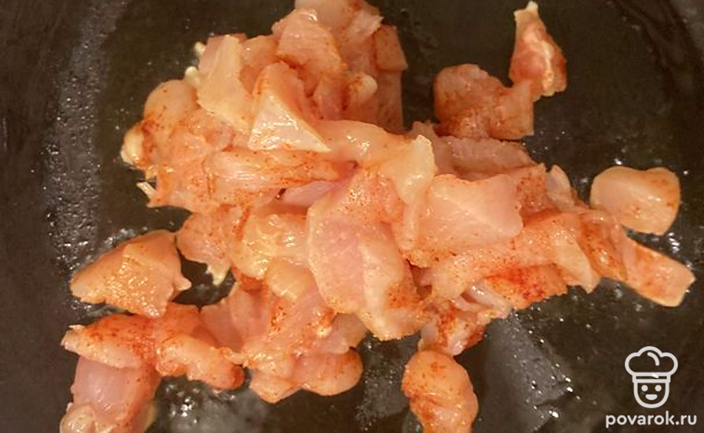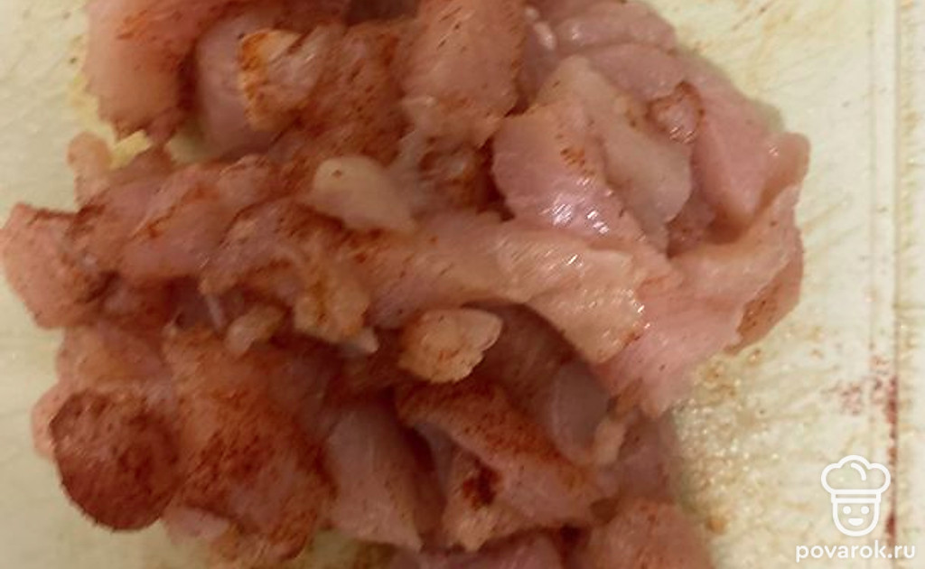 Нарезаем куриное филе на небольшие кусочки. Добавляем специи. У меня паприка и соль.