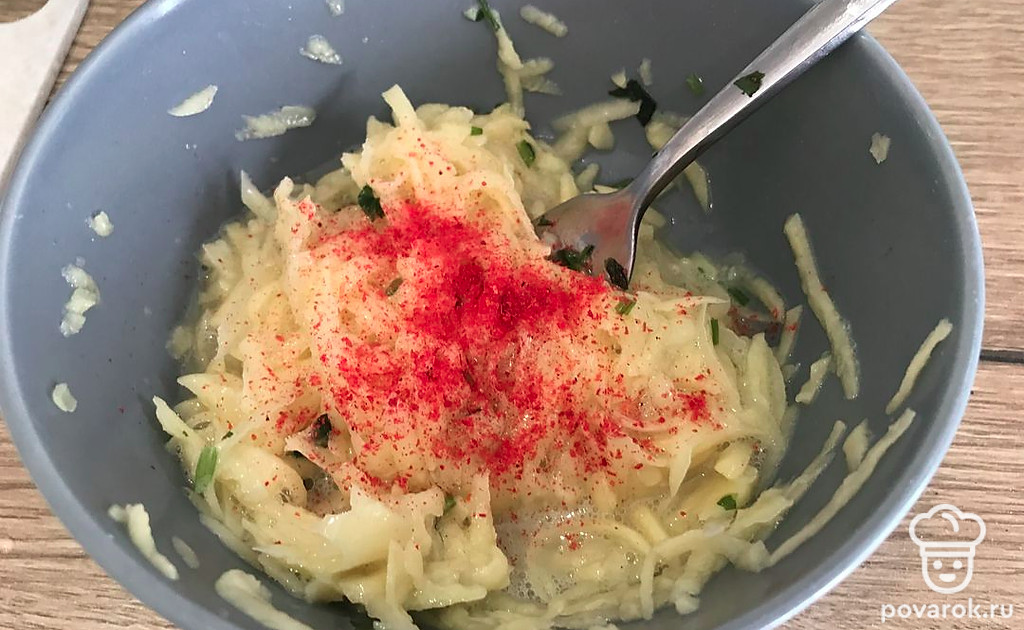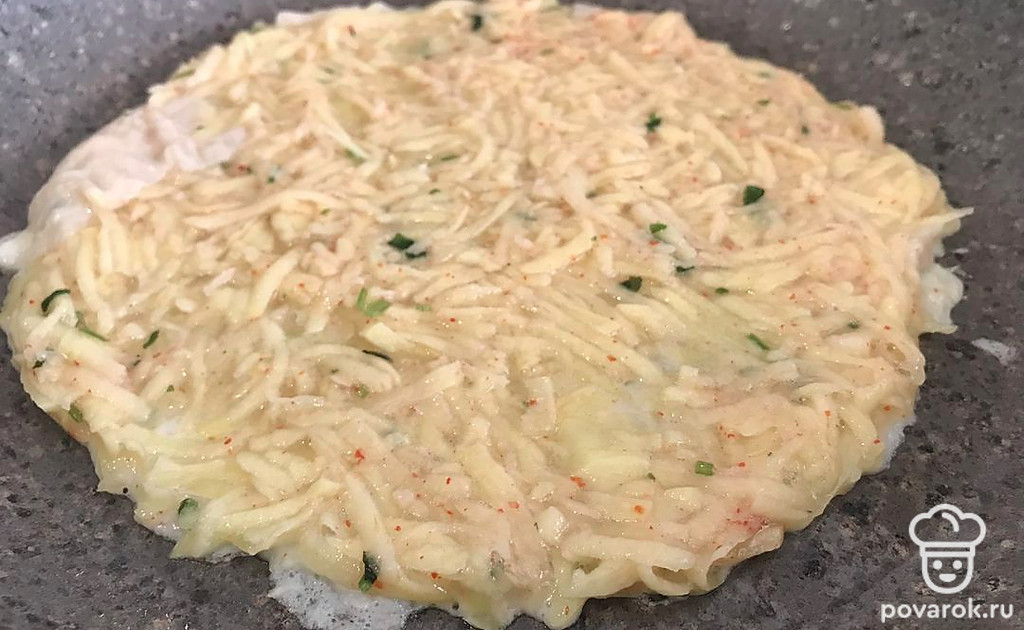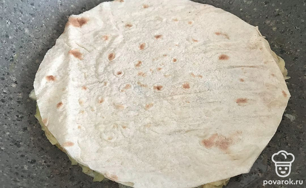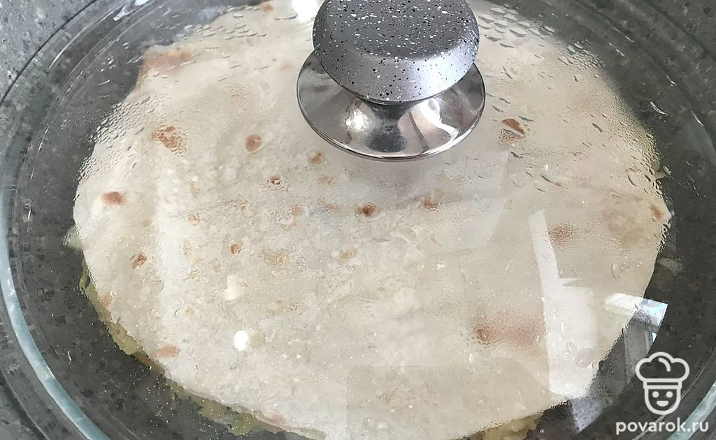 Накройте крышкой и до готовности картофеля (10 минут) держите лепешку на среднем огне.