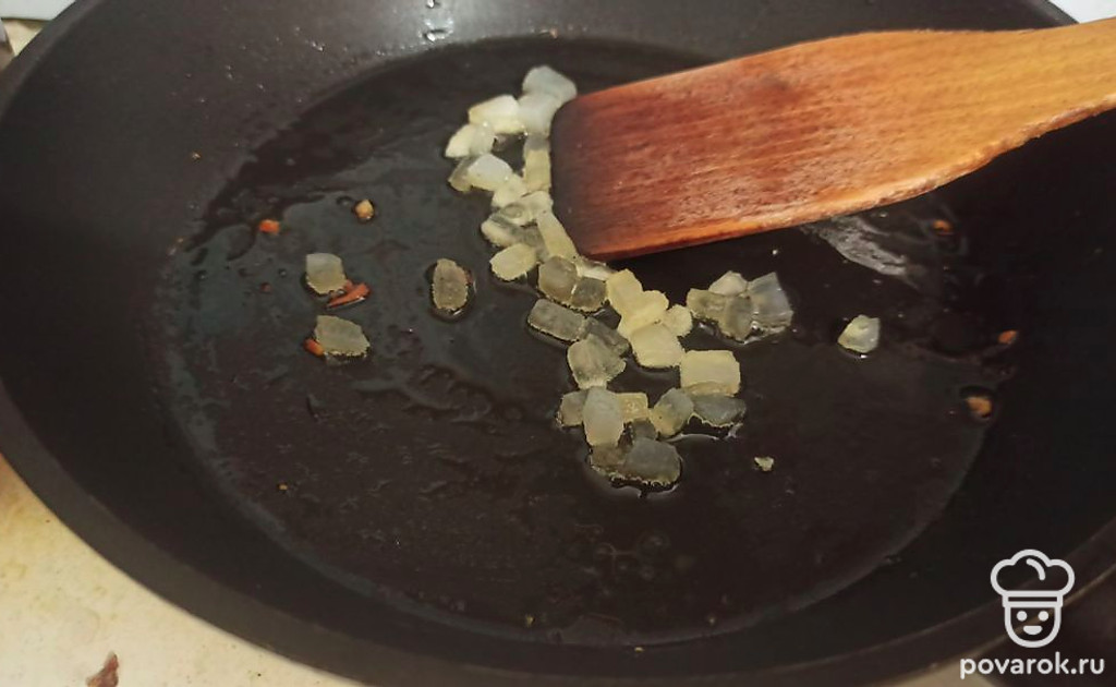 Сало мелко порежьте и обжарьте до прозрачного цвета.