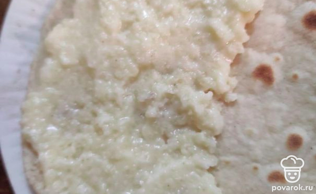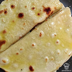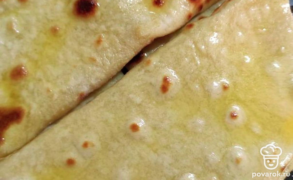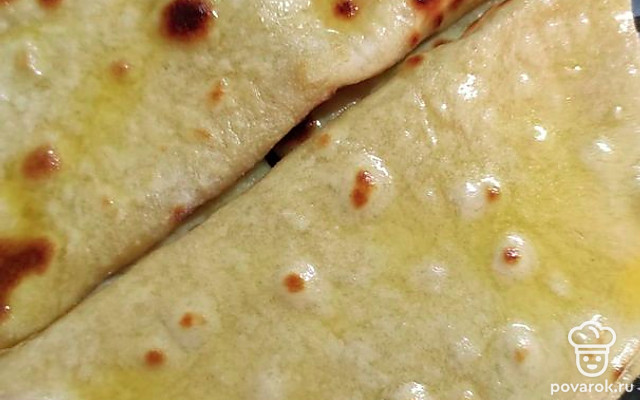 Потом на половину лепешки выкладываем начинку (пюре, кашу) и закрываем второй половиной лепешки. Смазываем растопленным сливочным маслом.