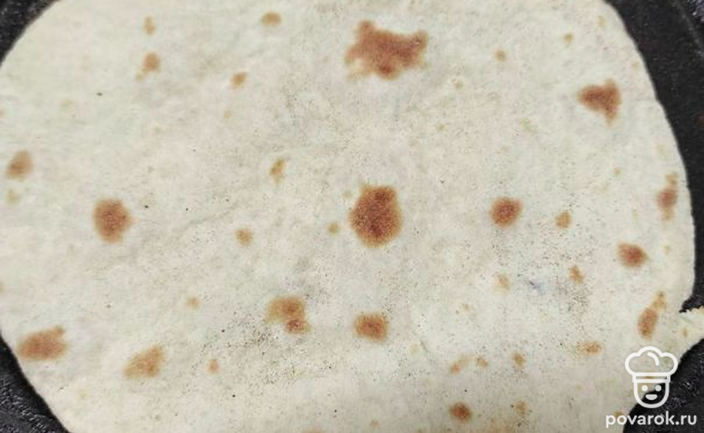 Делим тесто на кусочки и раскатываем лепешку, которую жарим с двух сторон на сухой сковороде.