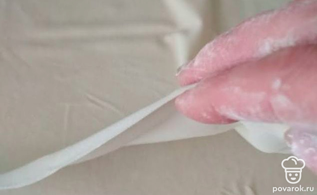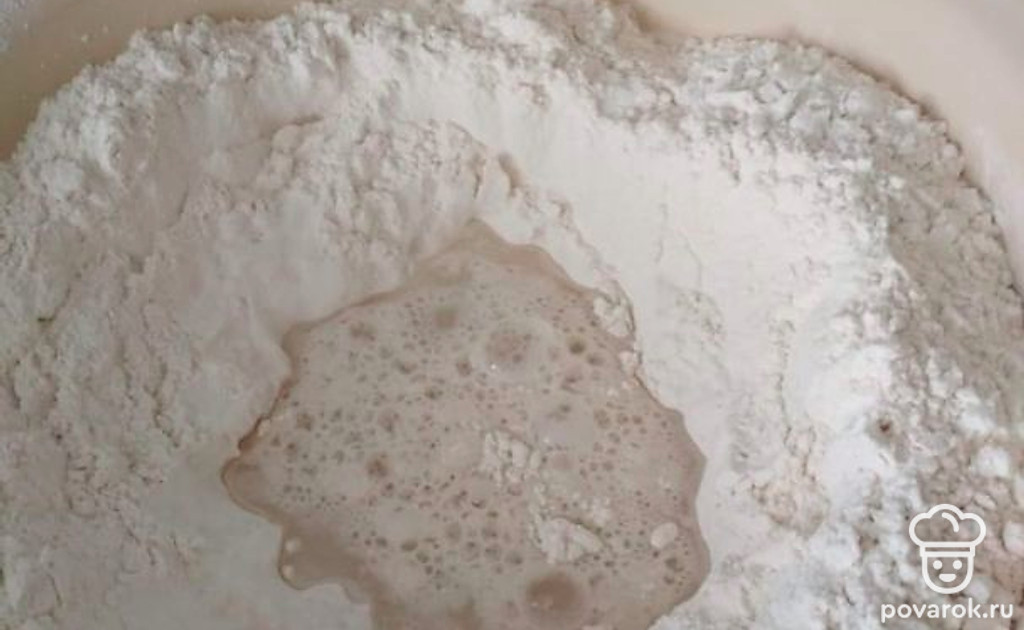 В муку добавим соль и воду, замешиваем бездрожевое тесто.