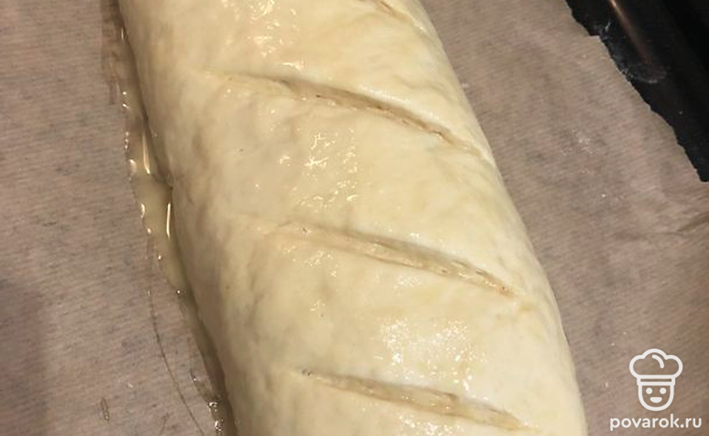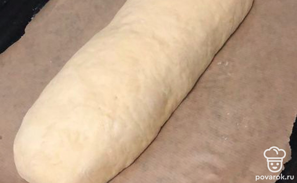 Далее необходимо достать тесто из миски и сформировать из него батон. Я это делаю методом скручивания в рулет, немного приминая серединку и края. Выложите сформированный батон на противень, застеленный пергаментом.