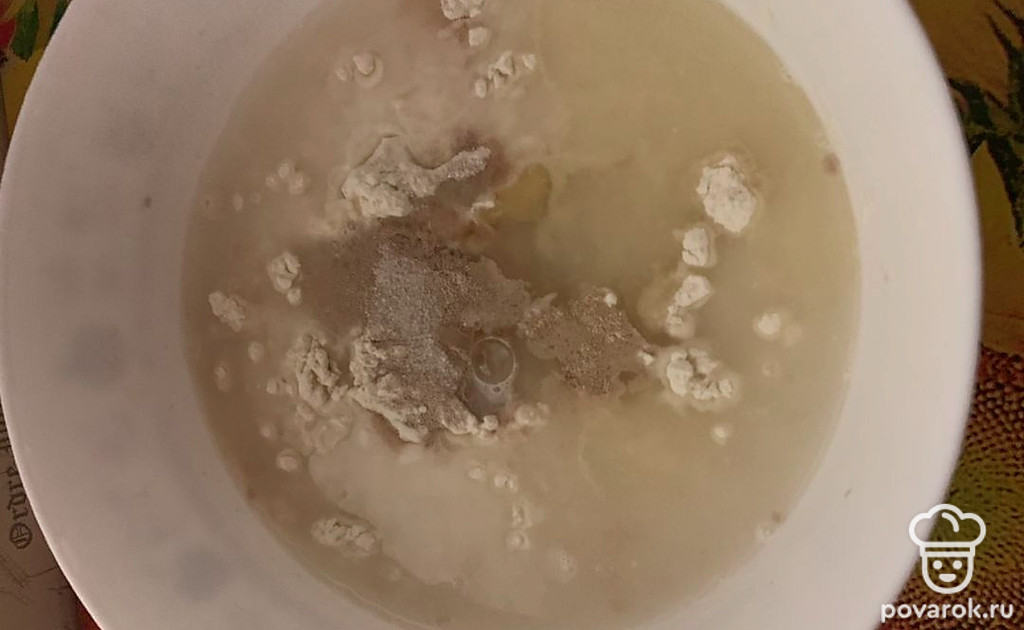 В миску просейте муку, добавьте все сухие ингредиенты, перемешайте, далее добавьте воды и масла.
