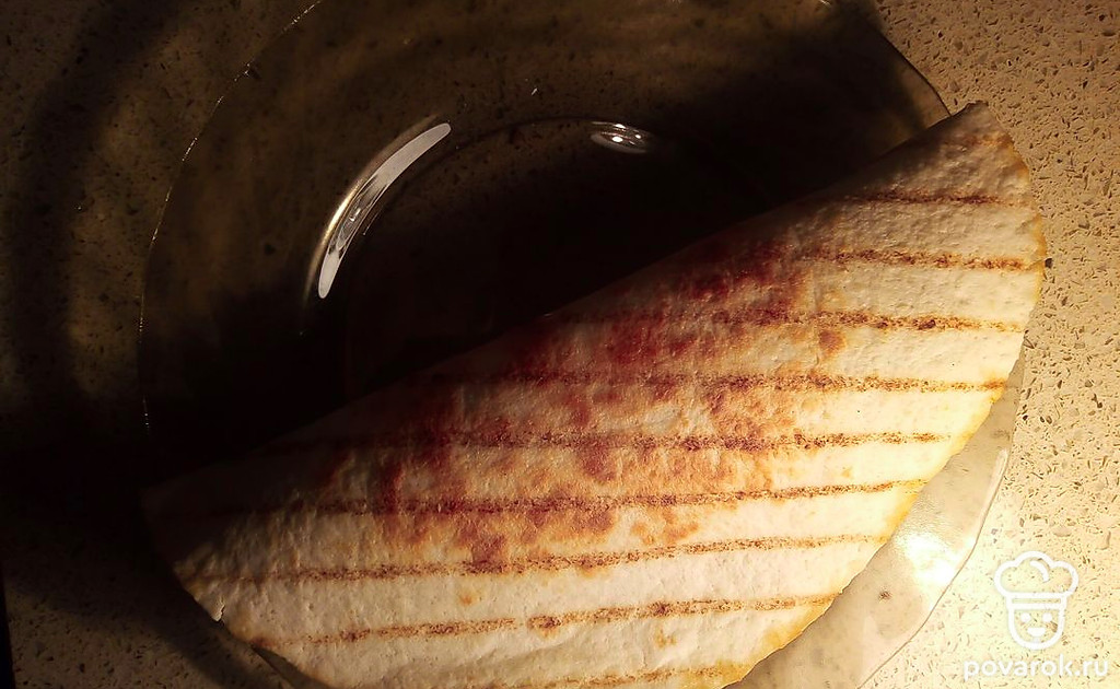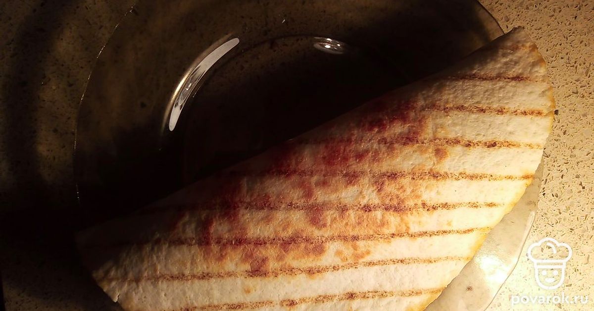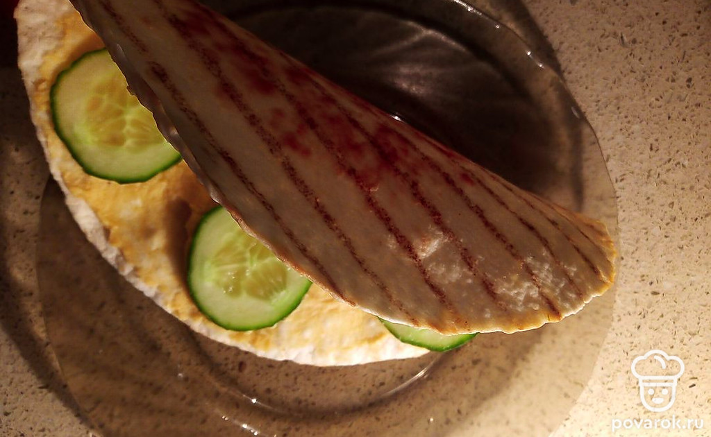Сверните лепешку вдвое, украсьте внутри ломтиками огурцов.