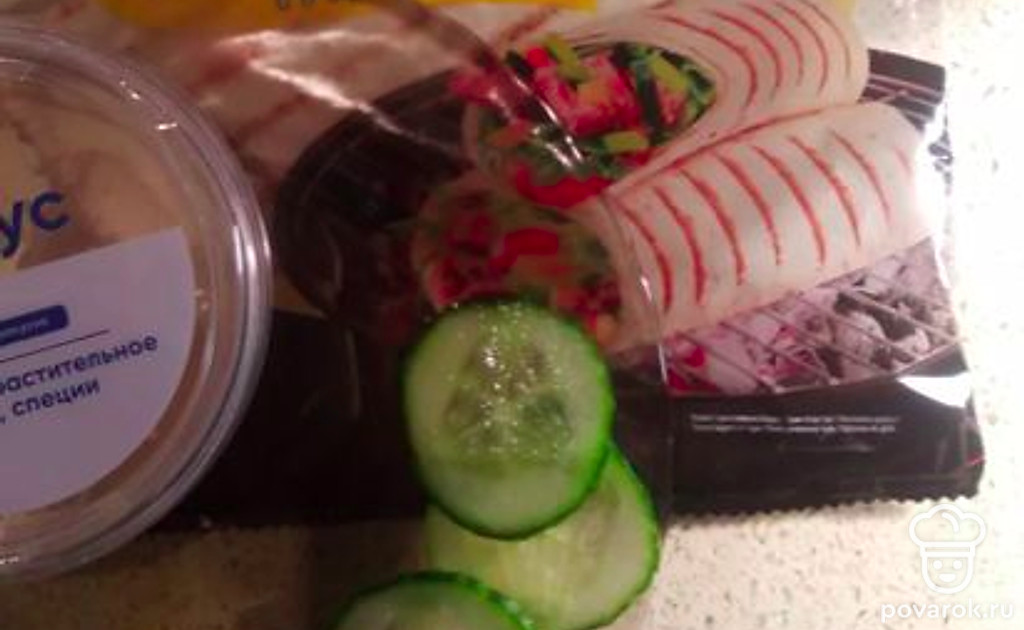 Подготовьте готовую лепешку, хумус, ломтики огурца.