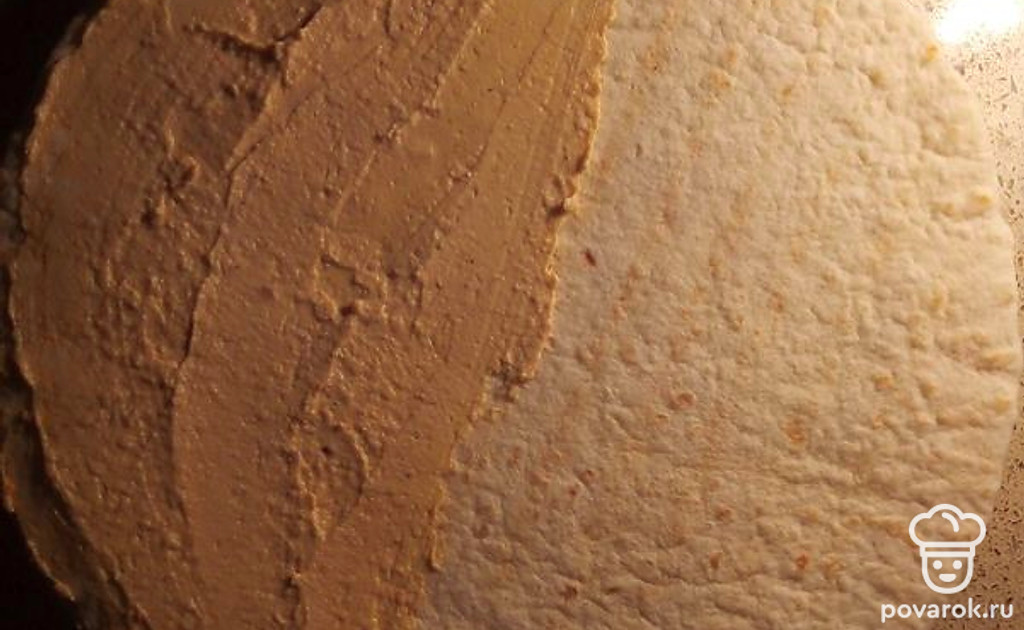 Намажьте половину лепешки хумусом.
