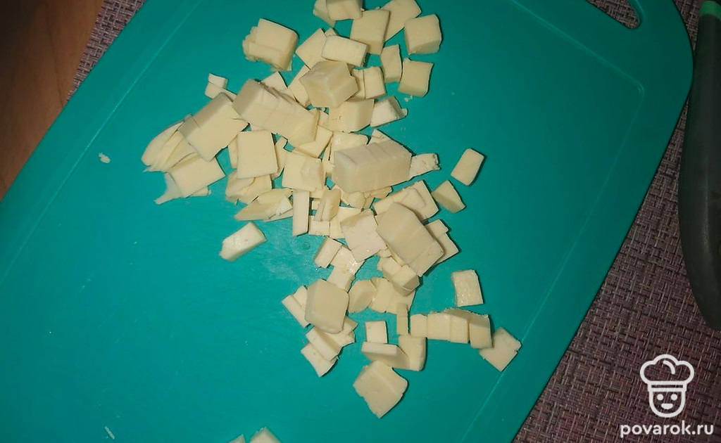 Нарезать кубиками или натереть сыр и все ещё раз размешать.
