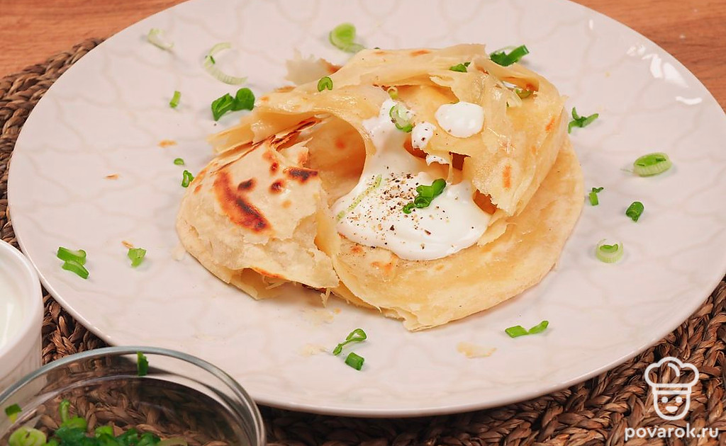 Обычно лепешки делают на основе муки, воды и дрожжей. Но есть и другие варианты этого блюда. Например, слоеные лепешки, приготовленные на сковороде. Они готовятся довольно быстро. Слоистость теста достигается за счет использования жирного молока и масла во время замеса. Воздержитесь от покупки спреда или маргарина. Согласно нашему рецепту слоеных лепешек, их добавлять нельзя. Чтобы проверить качество, перед добавлением в тесто выложите кусочек масла на раскаленную сковороду. Натуральное не плавится, а сразу тает.