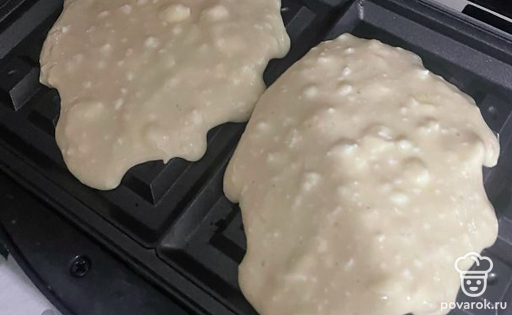 Вылейте по 2 ложки теста на вафельницу. Выпекайте до готовности.
