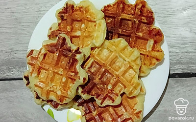 Всыпьте муку с разрыхлителем и хорошо перемешайте. Ложкой выложите готовое тесто в вафельницу, выпекайте до готовности в течение 5 минут.