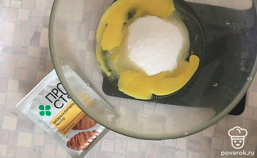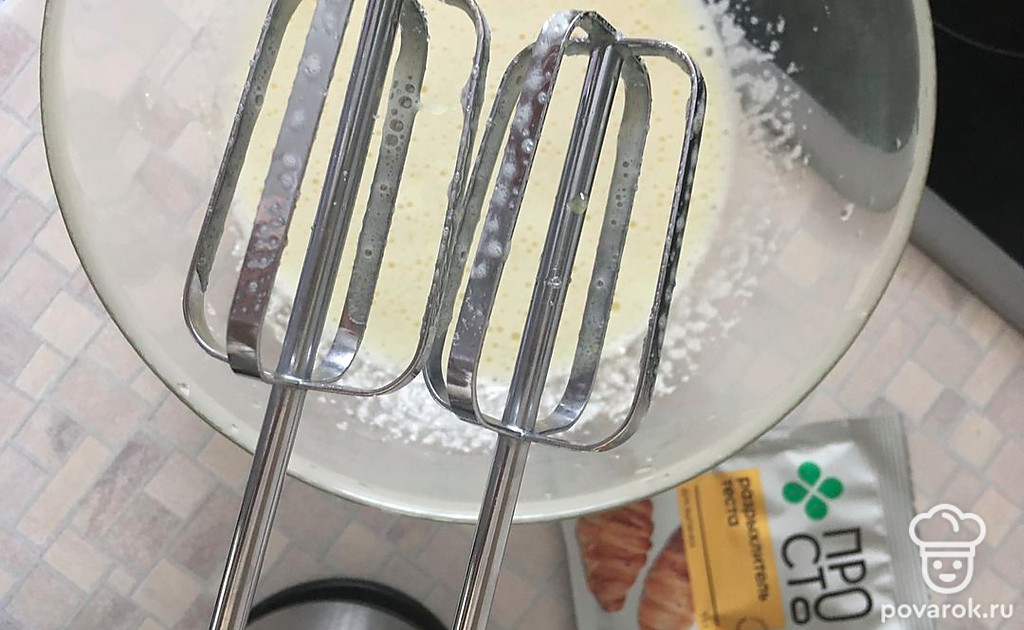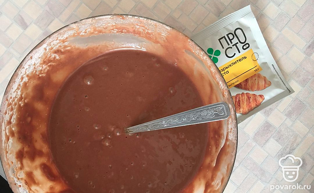 Влейте молоко и масло, перемешайте. Отдельно смешайте муку с какао и разрыхлителем.