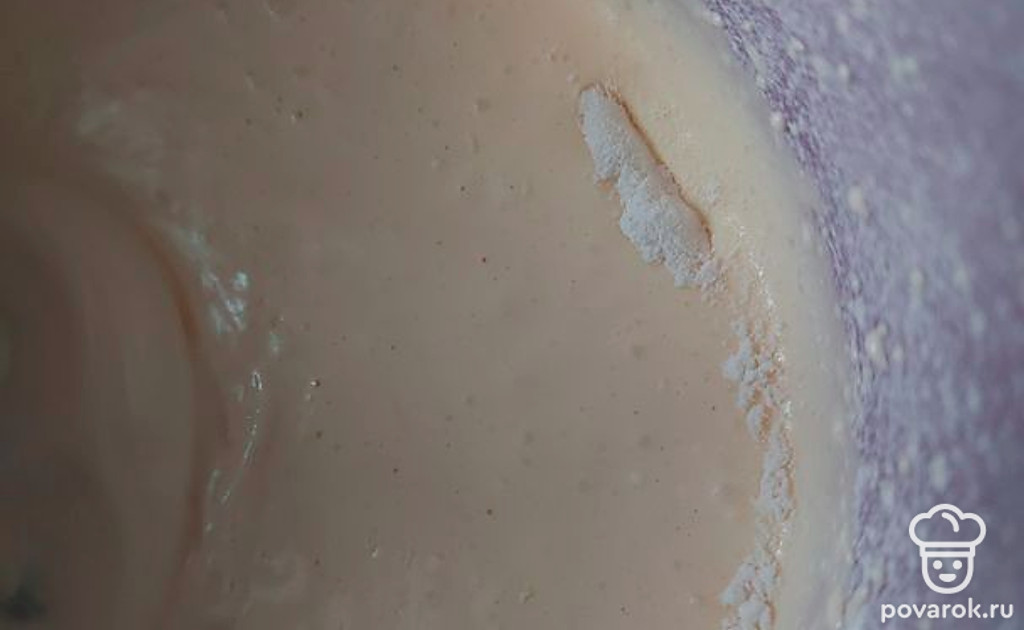 Не переставая взбивать, добавить муку с разрыхлителем. Замесить тесто.