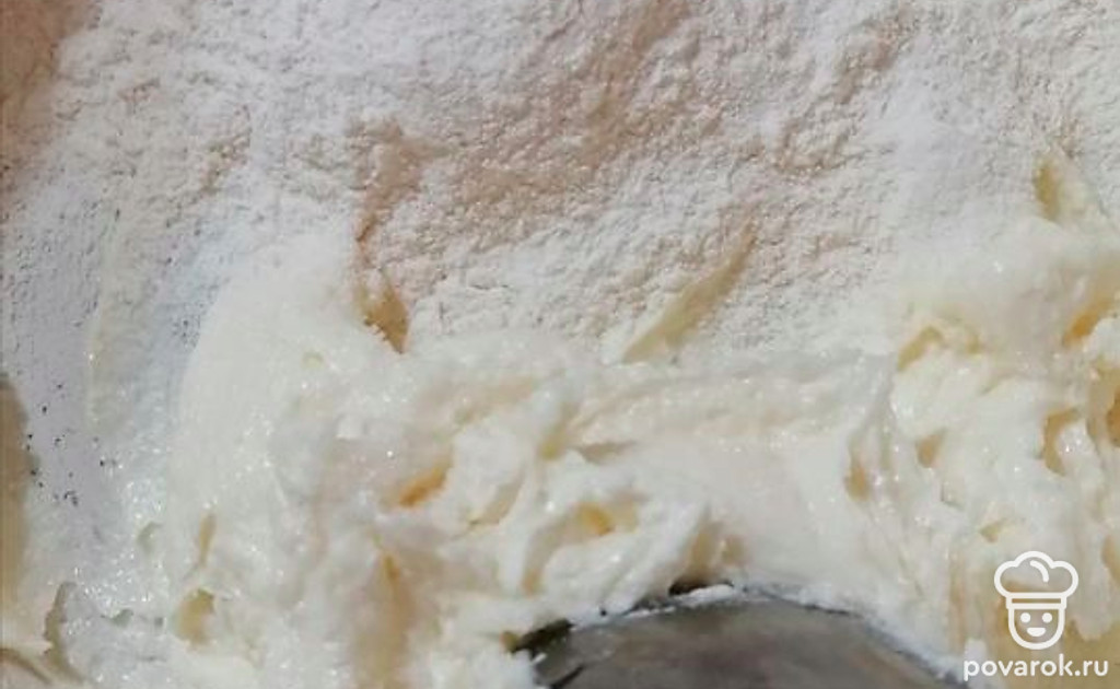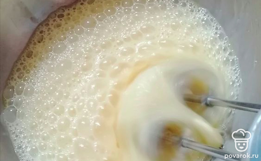 Добавьте муку, хорошо перемешайте. Влейте взбитые яйца, перемешайте миксером. Тесто готово.