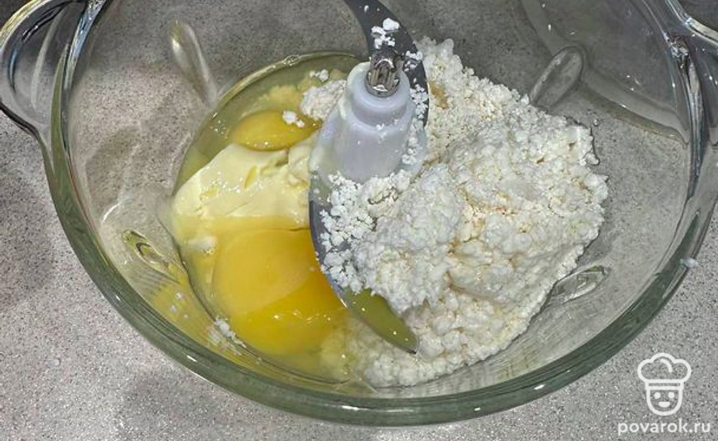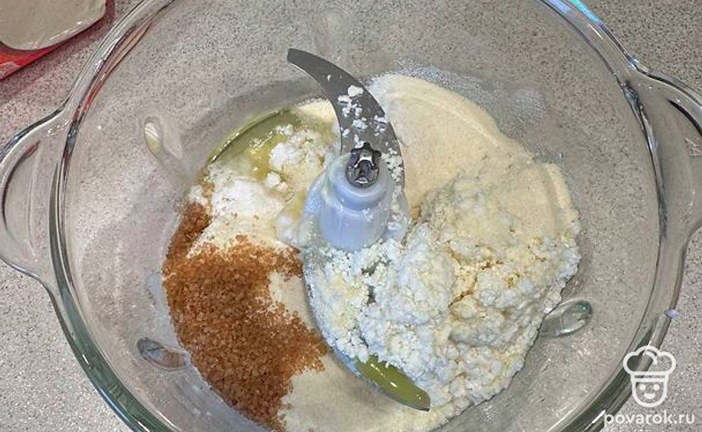 В чашу блендера выложите 200 граммов творога. Добавьте 2 яйца, 40 граммов сливочного масла (предварительно растопите в микроволновке или на плите, но не до конца), 1 столовую ложку сахара, 1 чайную ложку разрыхлителя, 1 грамм ванилина, 3 столовых ложки манки.