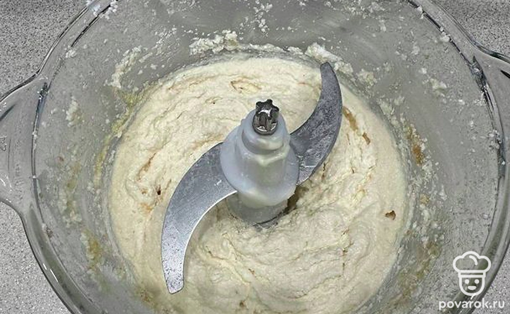 Пробейте блендером до однородной массы. Добавьте к массе 1 столовую ложку муки. Пробейте еще раз.
