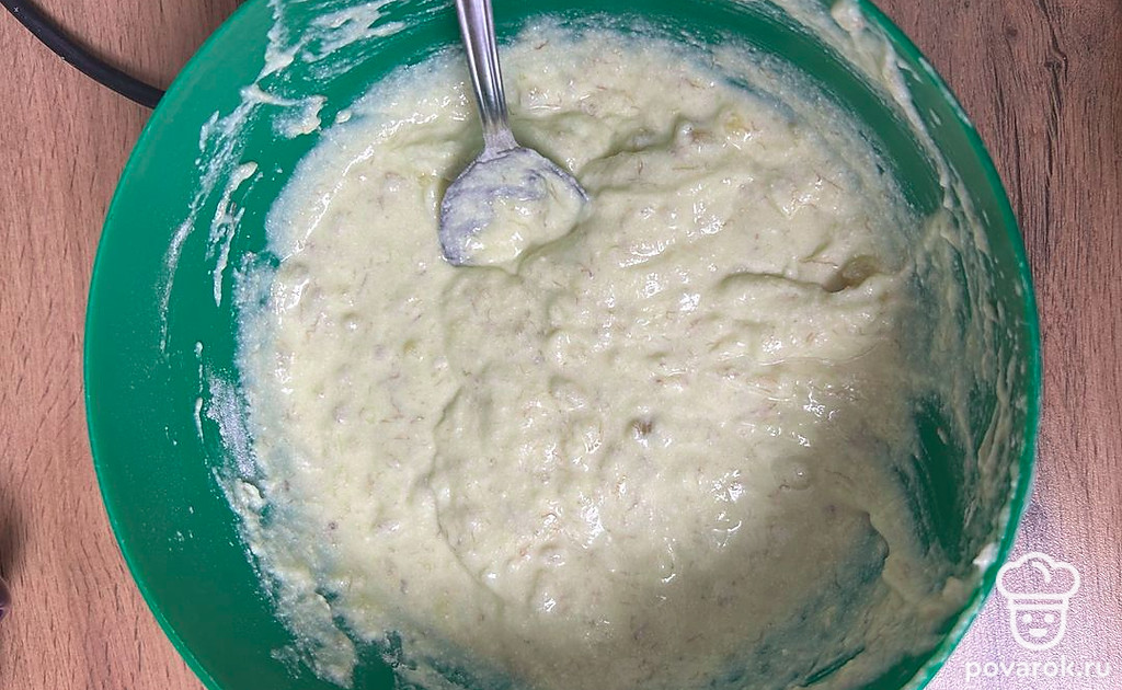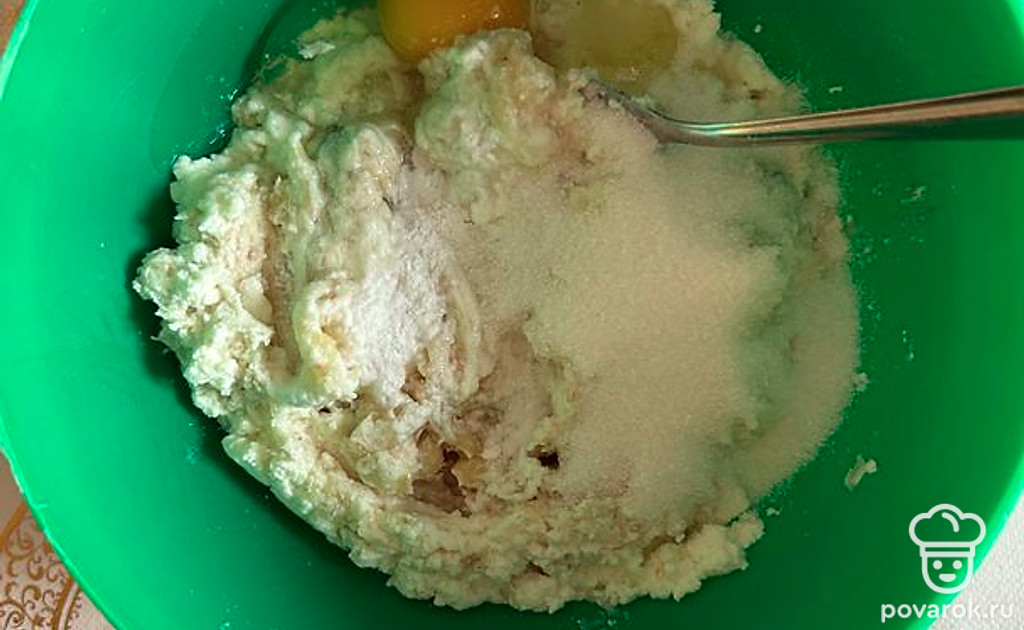 Переспелый банан разомните вилкой. Соедините творог, банан, яйца, соль, сахар и перемешайте.