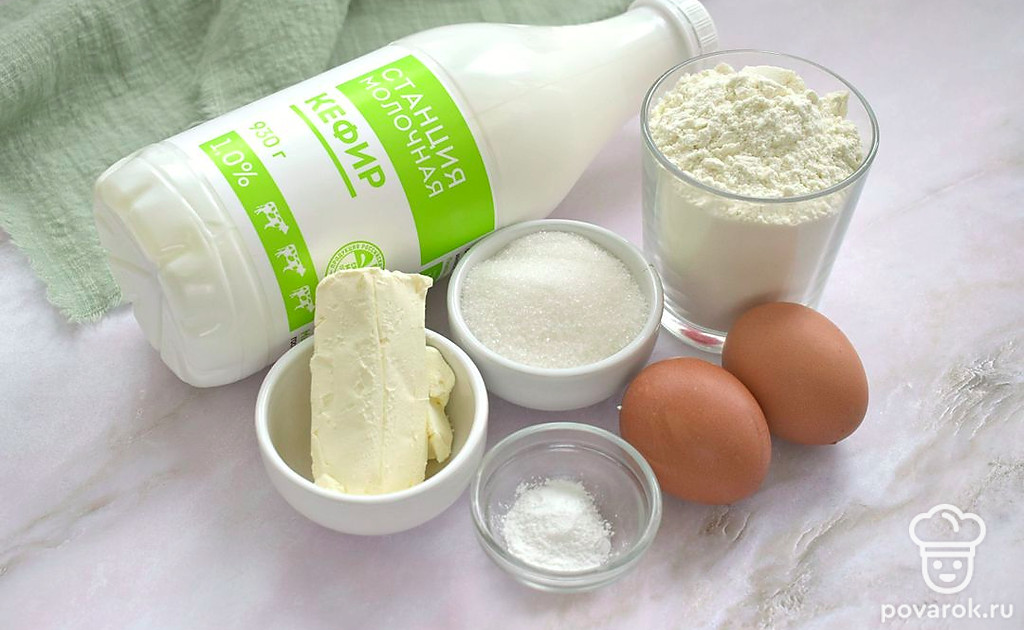 Подготовьте все ингредиенты. Заранее достаньте из холодильника кефир и куриные яйца. Эти продукты для замешивания теста должны быть комнатной температуры. Сливочное масло растопите в кастрюльке и остудите.
