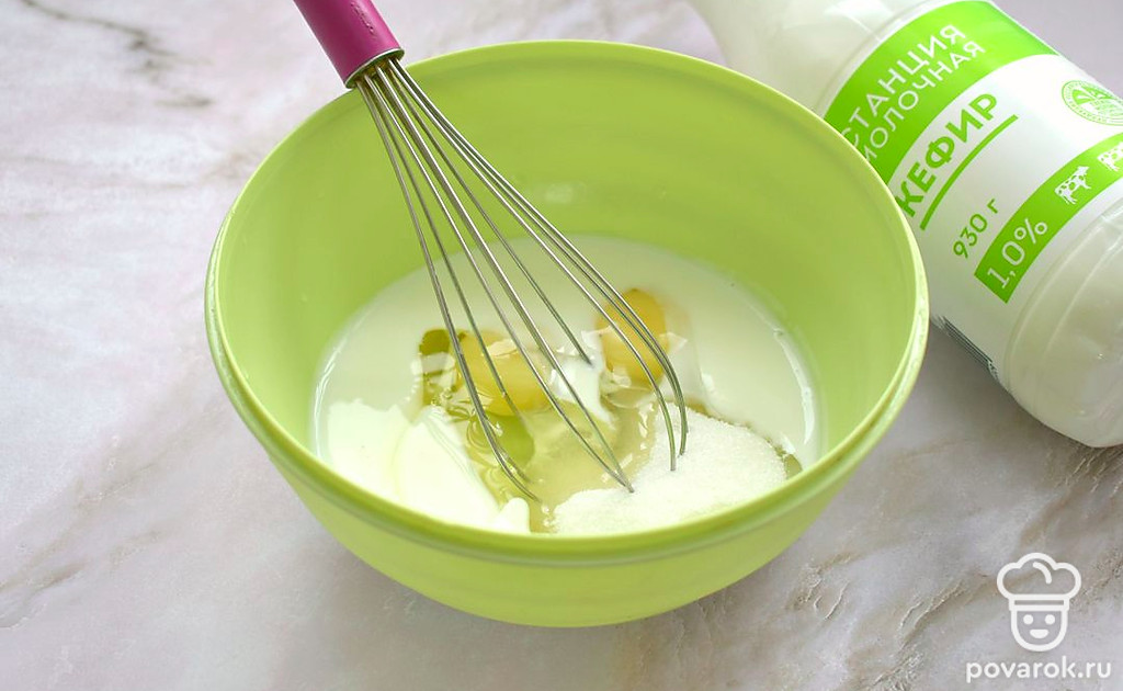 В миску разбейте куриные яйца, влейте кефир и всыпьте сахар. Количество сахара можно увеличить или уменьшить, ориентируйтесь на свой вкус.