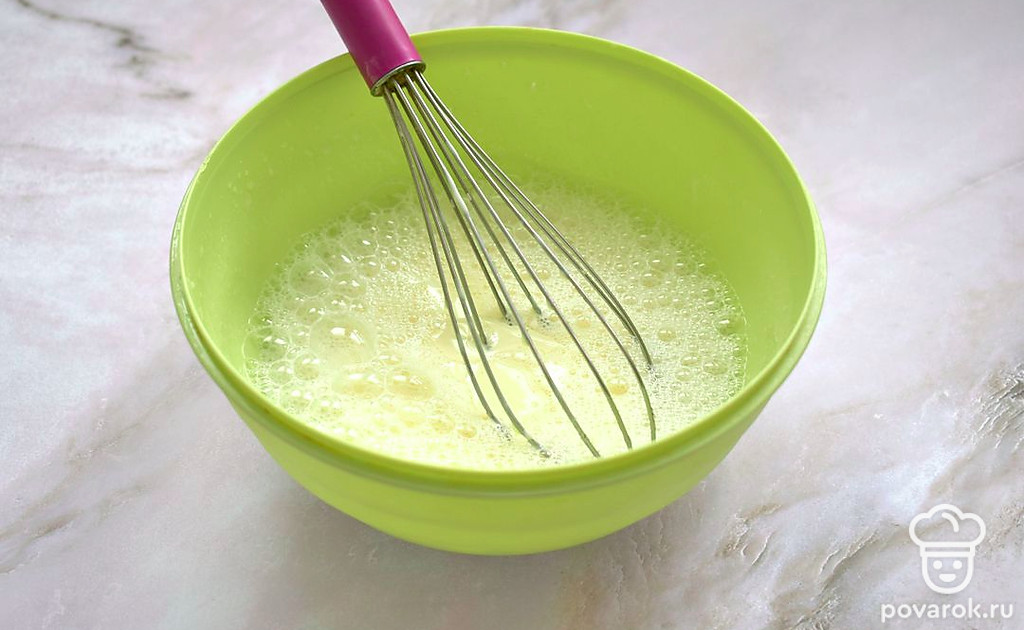 Ингредиенты взбейте миксером или ручным венчиком до однородной смеси. В кефирно-яичную смесь вылейте растопленное сливочное масло, снова перемешайте ингредиенты.