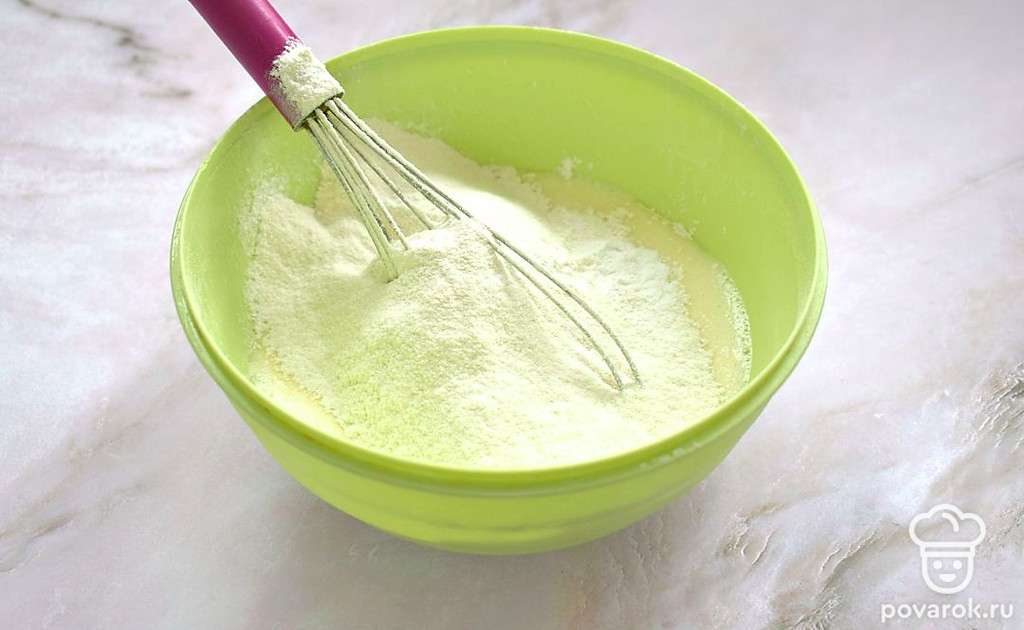 В состав, который получился, просейте пшеничную муку вместе с разрыхлителем для теста.