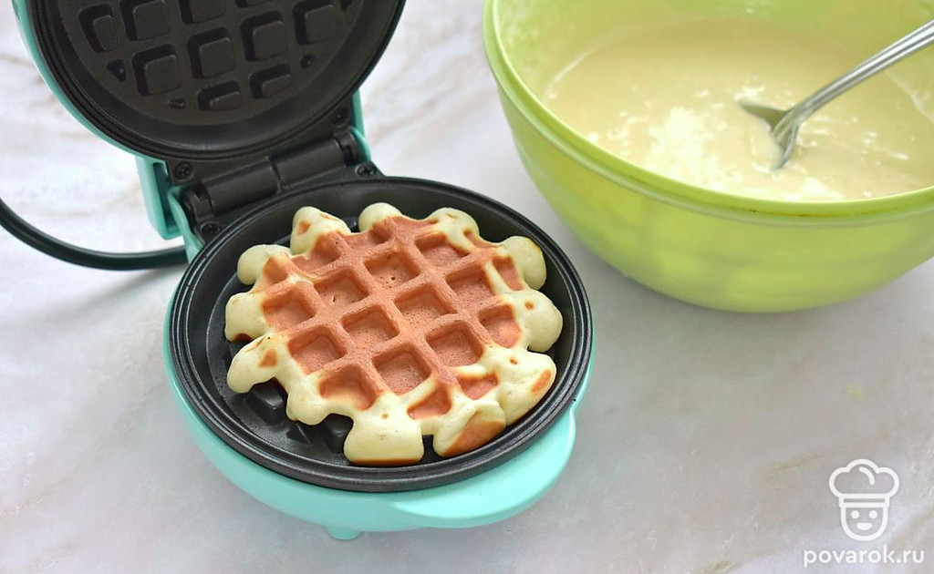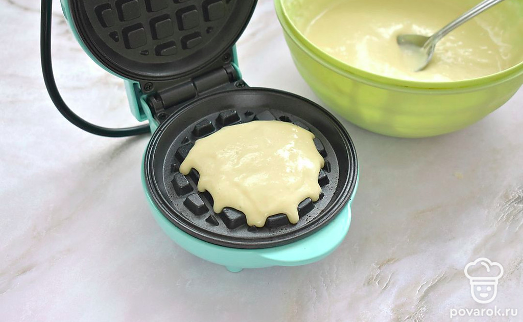 Включите электровафельницу и смажьте по необходимости панели растительным маслом. Когда вафельница хорошо прогреется, в центр нижней панели поместите 2 столовых ложки приготовленного теста.