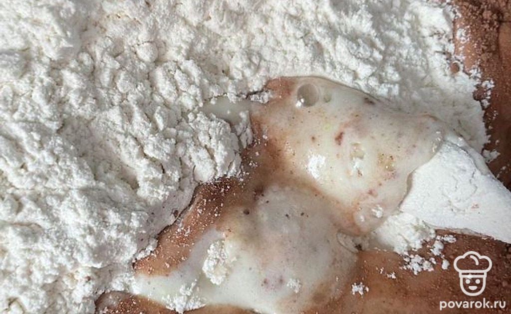 Добавьте муку, какао и разрыхлитель. Снова перемешайте.