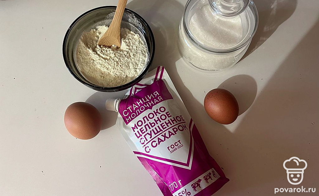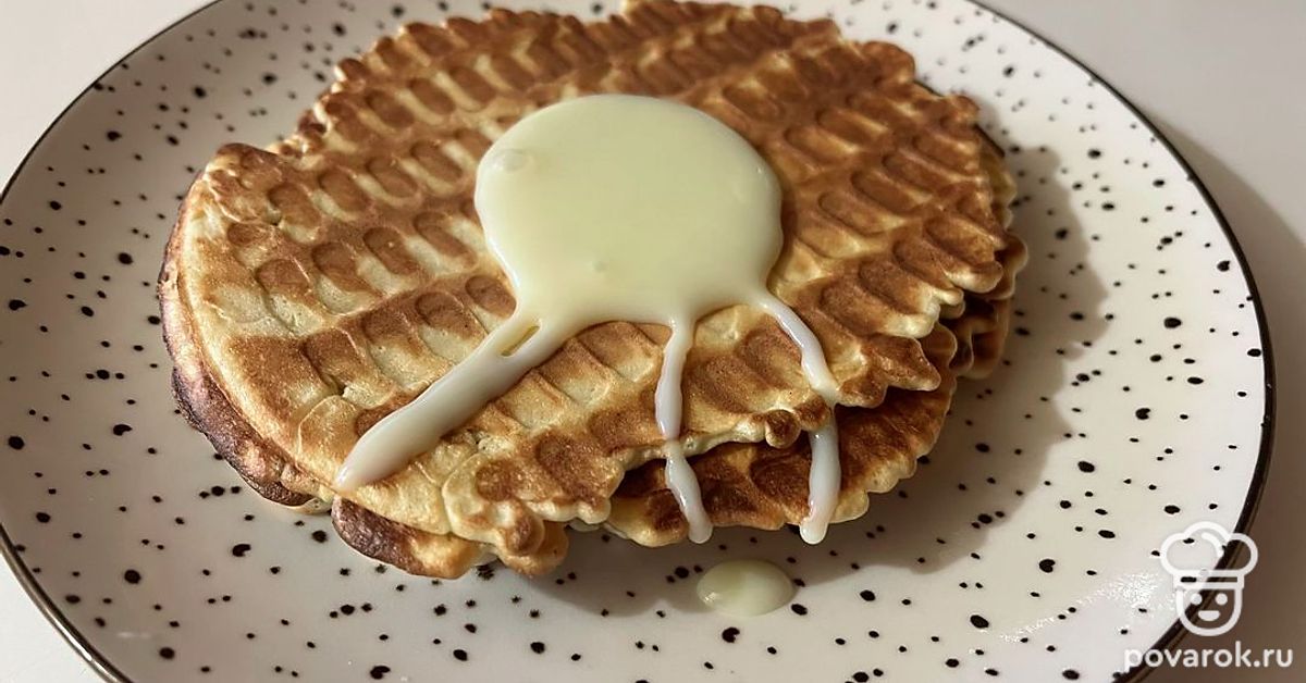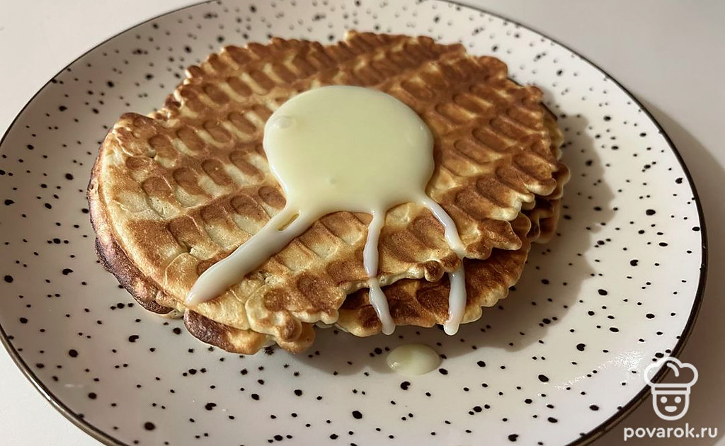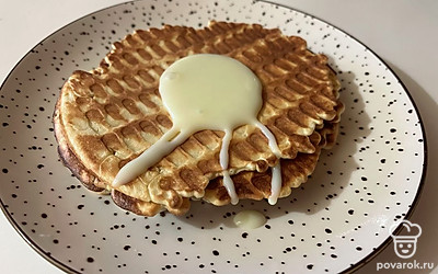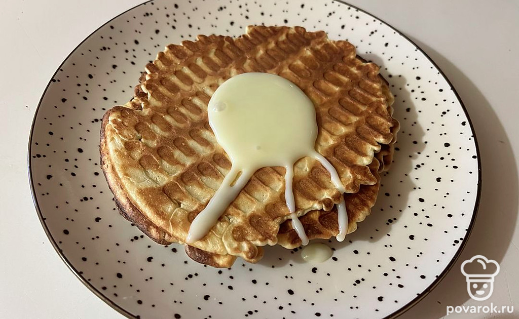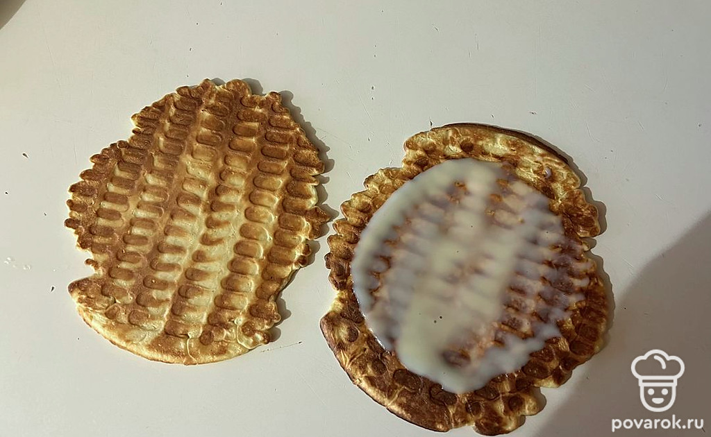 Две вафельки обильно смажьте сгущенным молоком и накройте оставшимися вафлями.