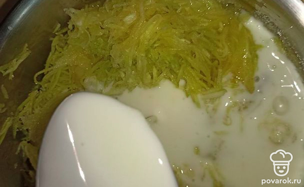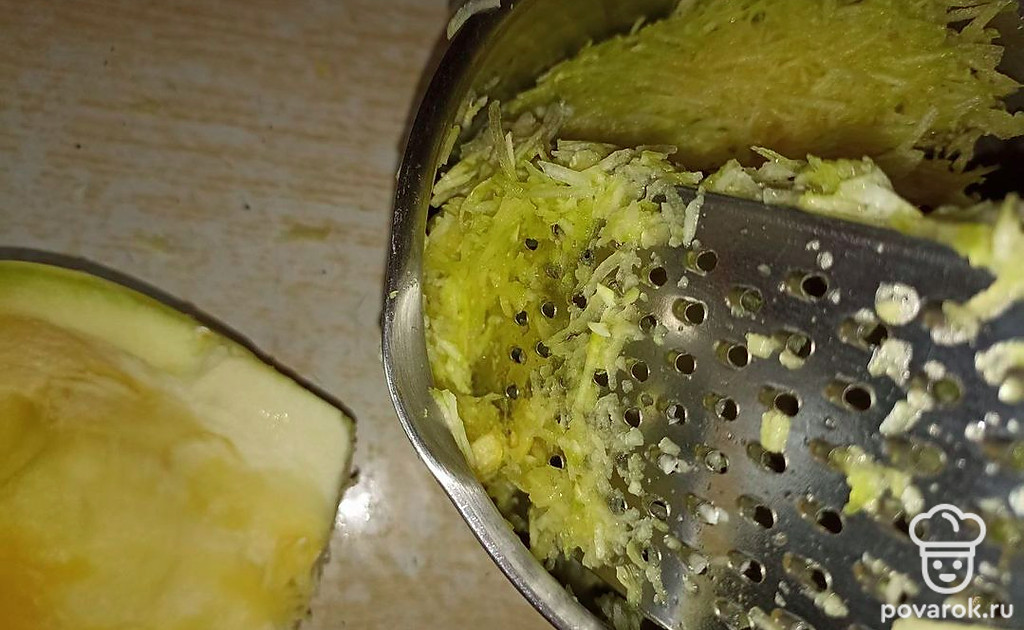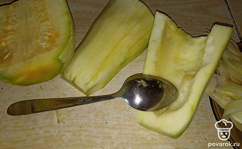 Моем кабачок и чистим его. Удаляем мякоть и косточки с помощью ложки.