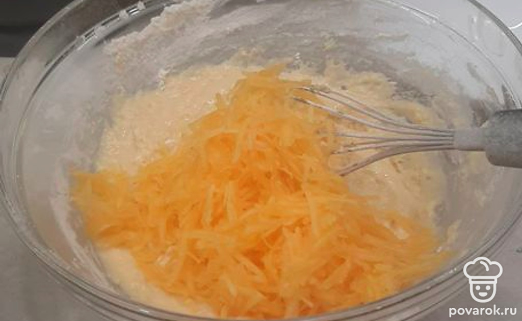 Тыкву очистить и натереть на мелкой терке, добавить к массе. Все еще раз хорошо размешать.