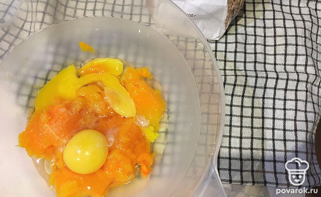 К тыкве добавить яйца, соль, растопленное сливочное масло и хорошо перемешать.