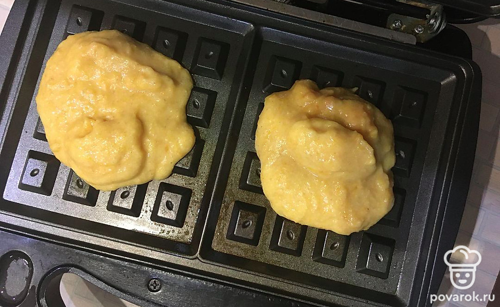 Выкладывать столовой ложкой в разогретую вафельницу. Печь до готовности.