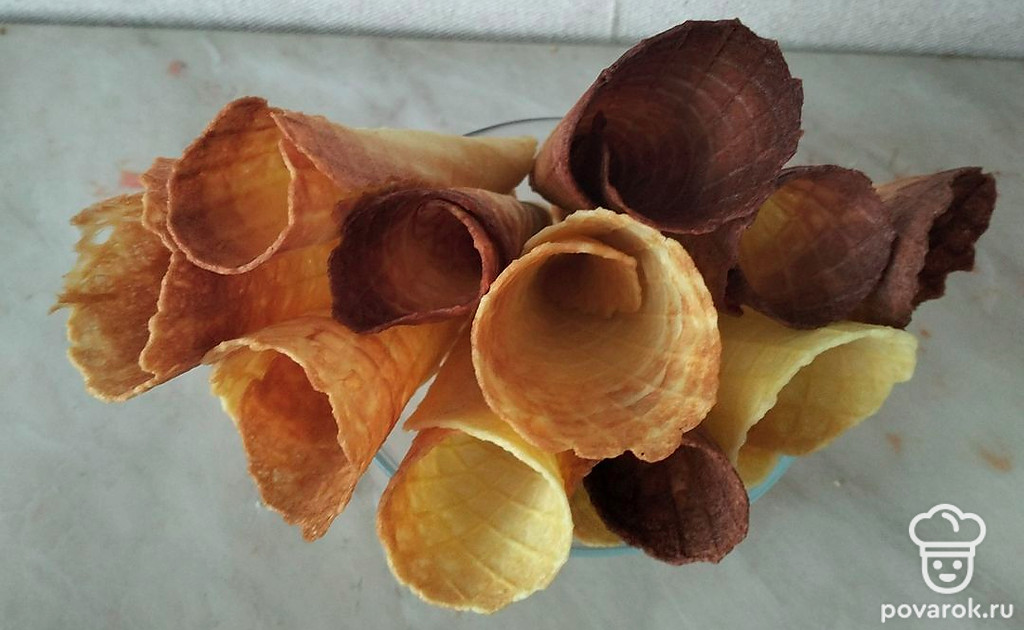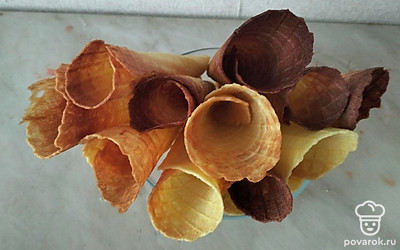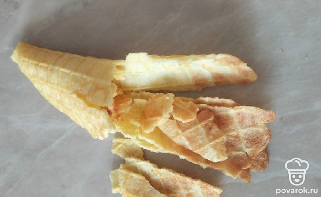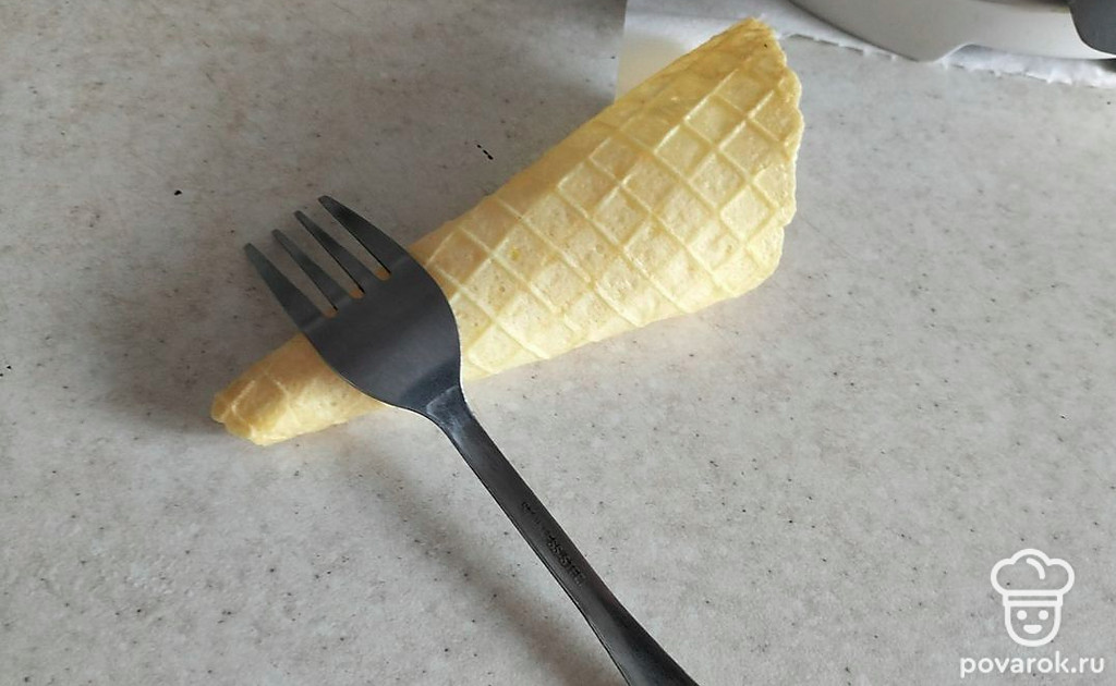 Горячие вафли заворачиваем в конус и с помощью вилки фиксируем форму. Даем остыть.