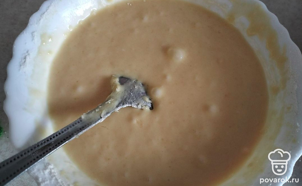 Добавляем разрыхлитель и муку, замешиваем тесто. Тесто должно быть как густая сметана.