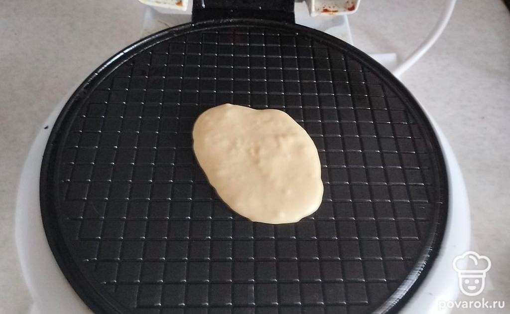Нагреваем вафельницу и выкладываем столовую ложку теста. Жарим по 1,5 минуты, а лучше ориентируйтесть на свою вафельницу.