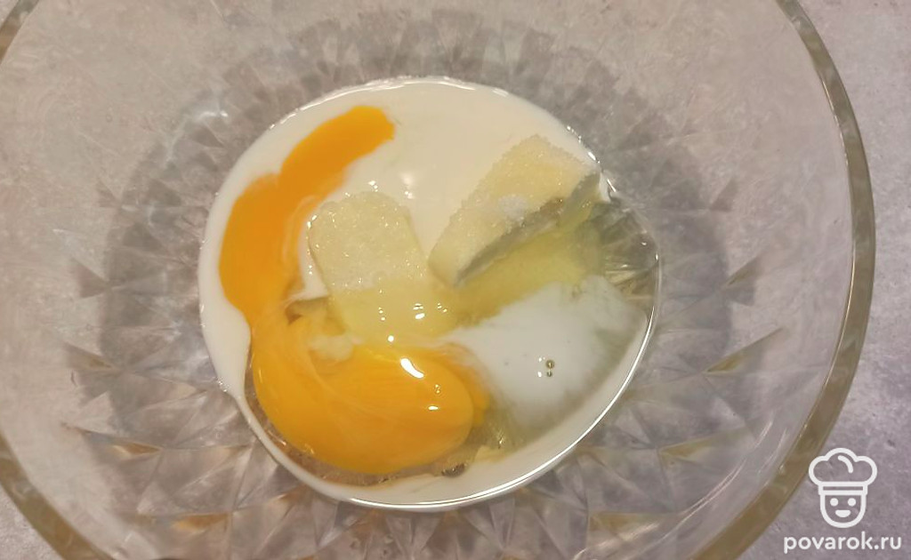 Далее вбиваем в миску яйцо и доливаем молоко.