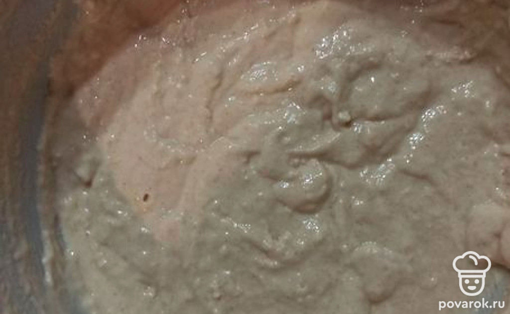 Добавить расплавленное сливочное масло, банан, размягченный в блендере, муку и разрыхлитель. Все перемешать.