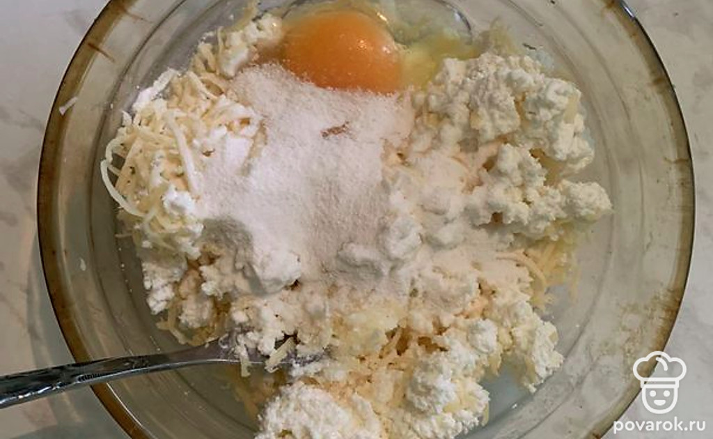 Творог в брикете (любая жирность) смешать с любым твердым сыром, добавить все остальные ингредиенты. Муку можно любую.