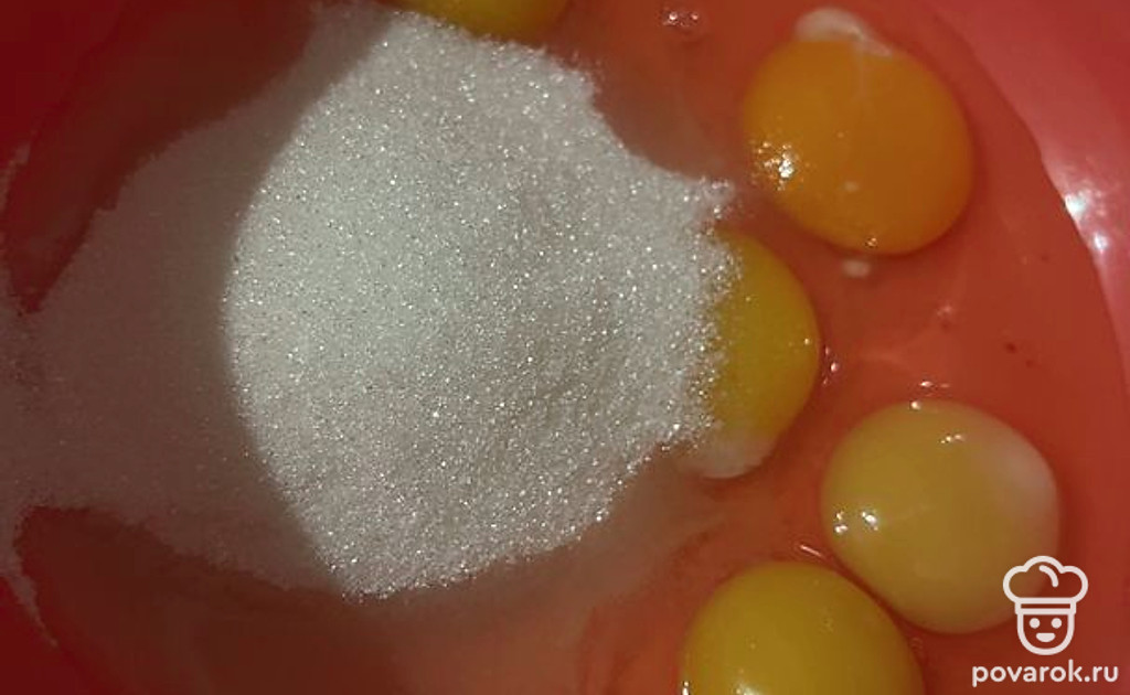 В миску разбить яйца и смешать их с сахаром. Добавить размягчённый маргарин и перемешать.