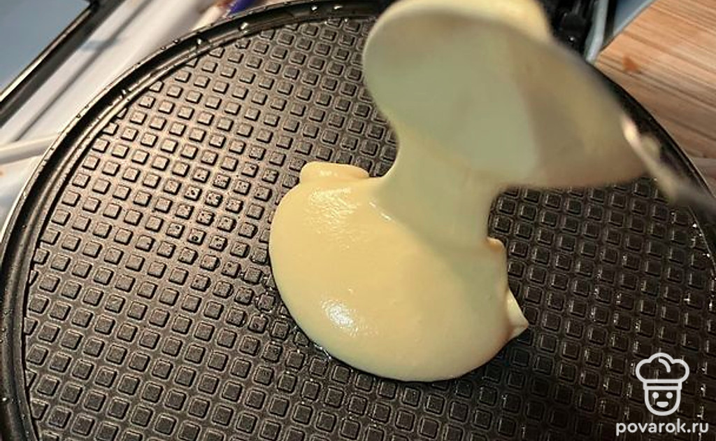 Разогреть вафельницу и выпекать (выкладывать по одной ложке теста).