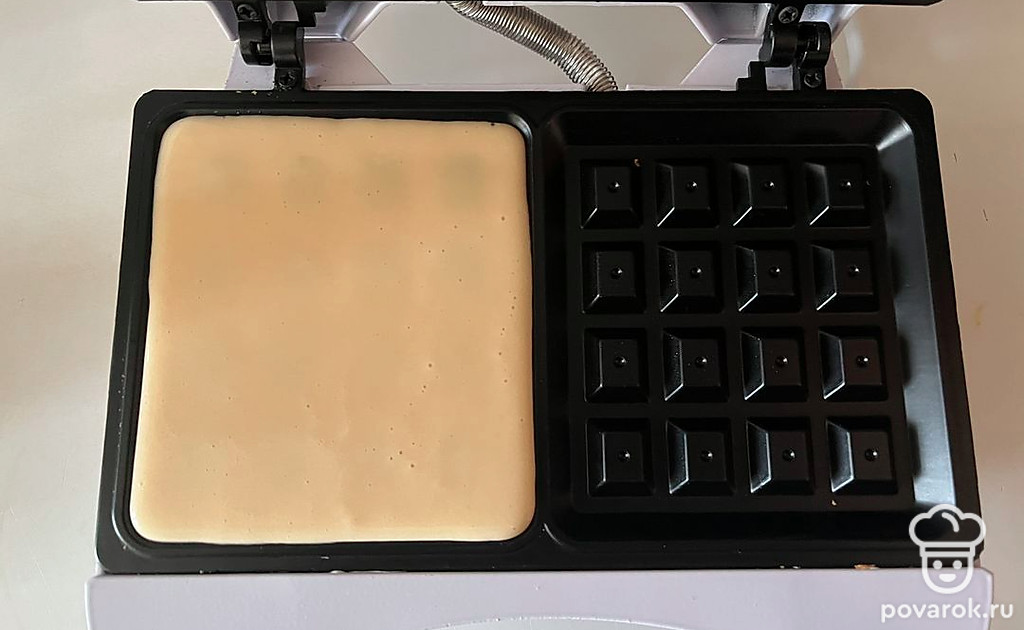 Вылейте тесто в вафельницу и обжаривайте ее в течении 5-8 минут.