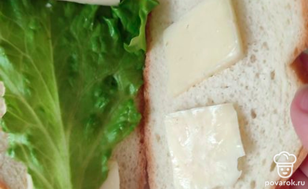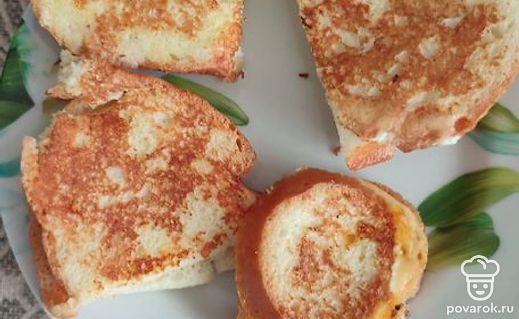 Укладываем на кусок батона сыр. Можно добавить зелени, помидор для вкуса. Накрываем сверху вторым куском батона и окунаем в болтушку из яйца и молока.