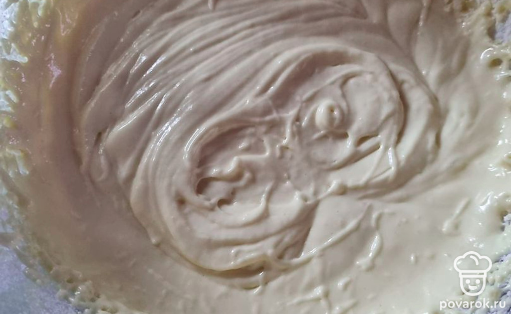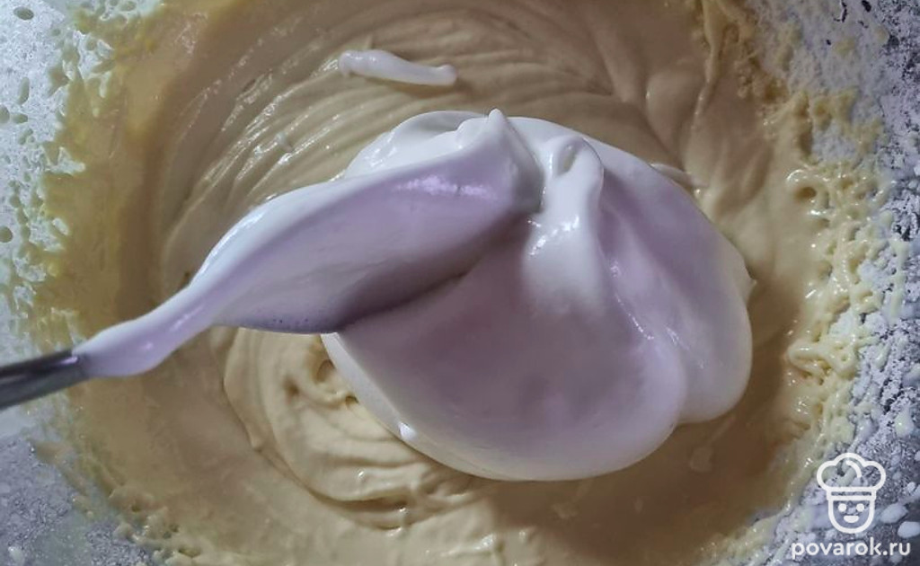 Аккуратно в 4 приема выкладывать взбитые белки и размешать.