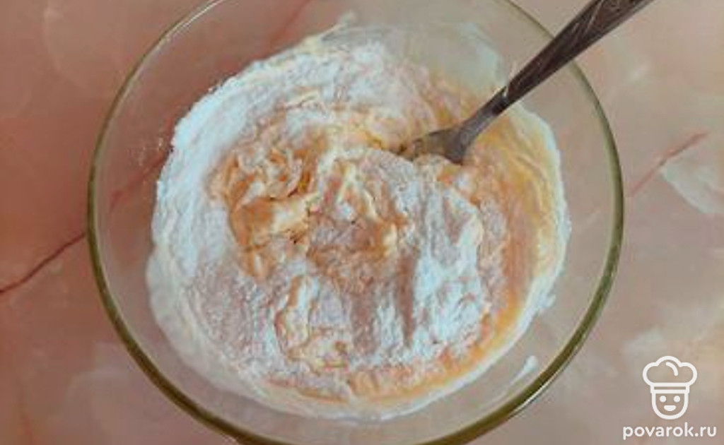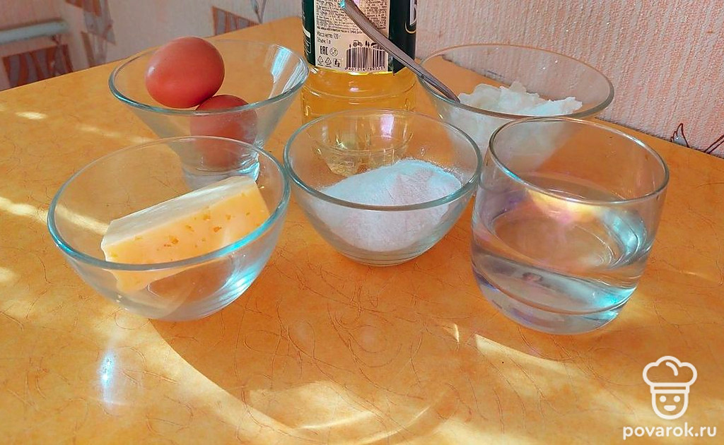 Выложить тертый сыр и муку. Тщательно перемешать. Долить воду, можно заменить на молоко. Тесто должно получиться как тесто на оладьи.