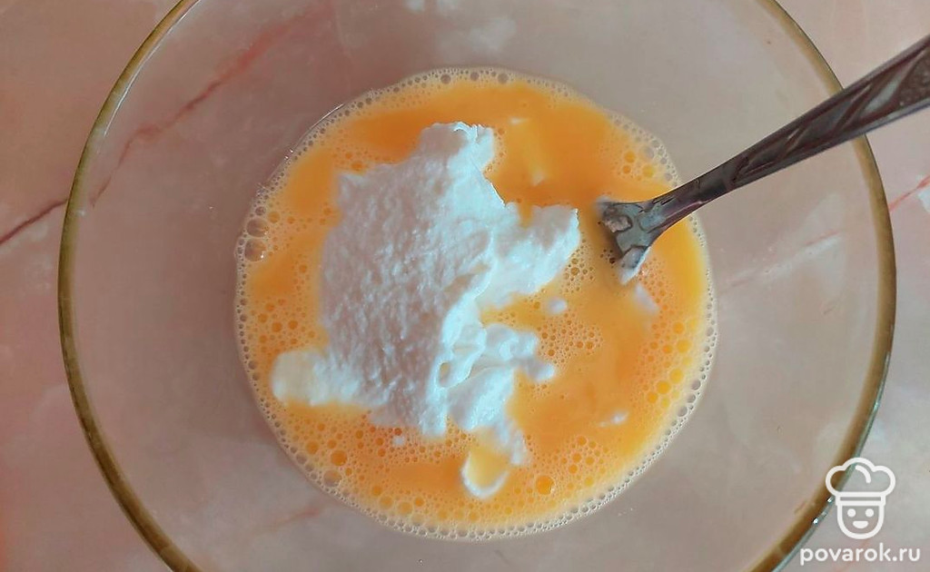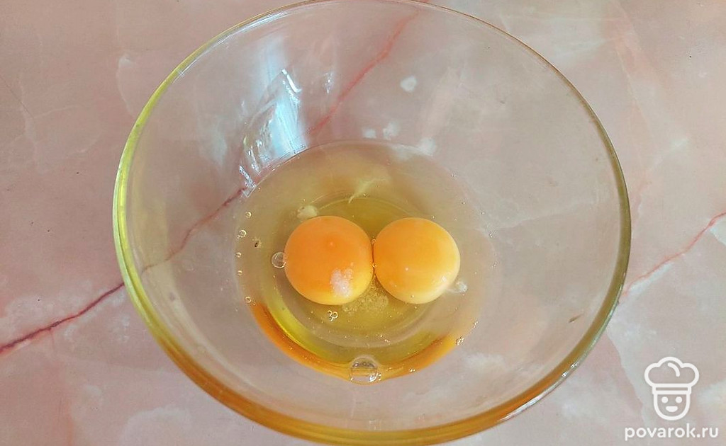 В емкость поместить яйца. Взбить их вилкой или венчиком.