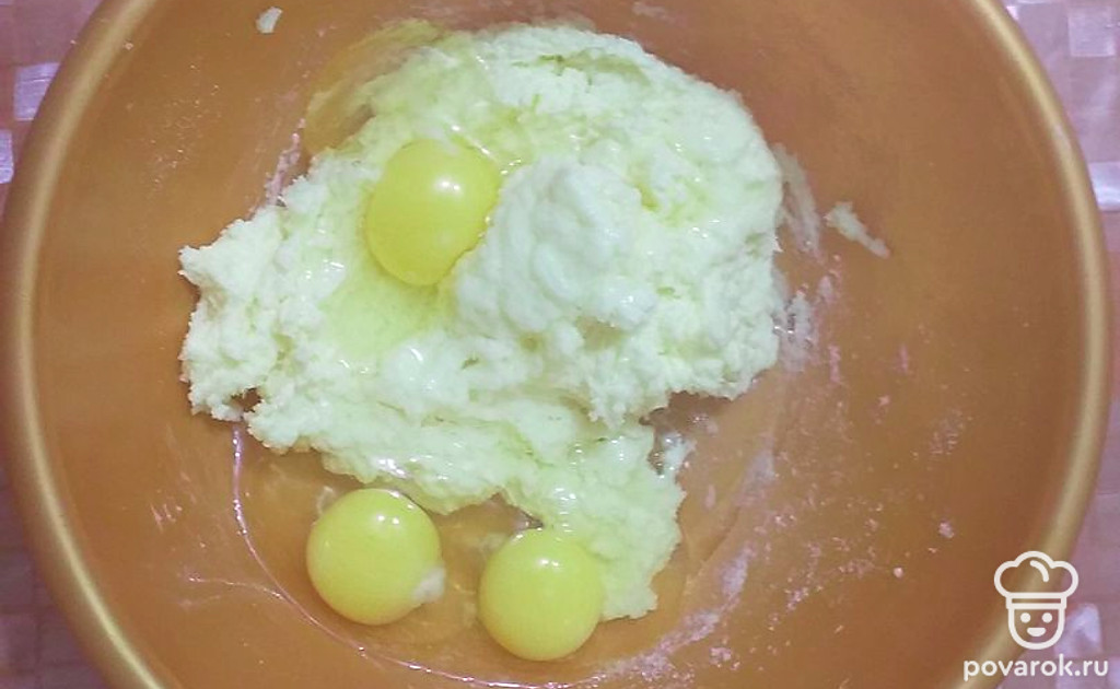 Сливочное масло комнатной температуры перетереть с сахаром, добавить щепотку соли и яйца. Все перемешать.